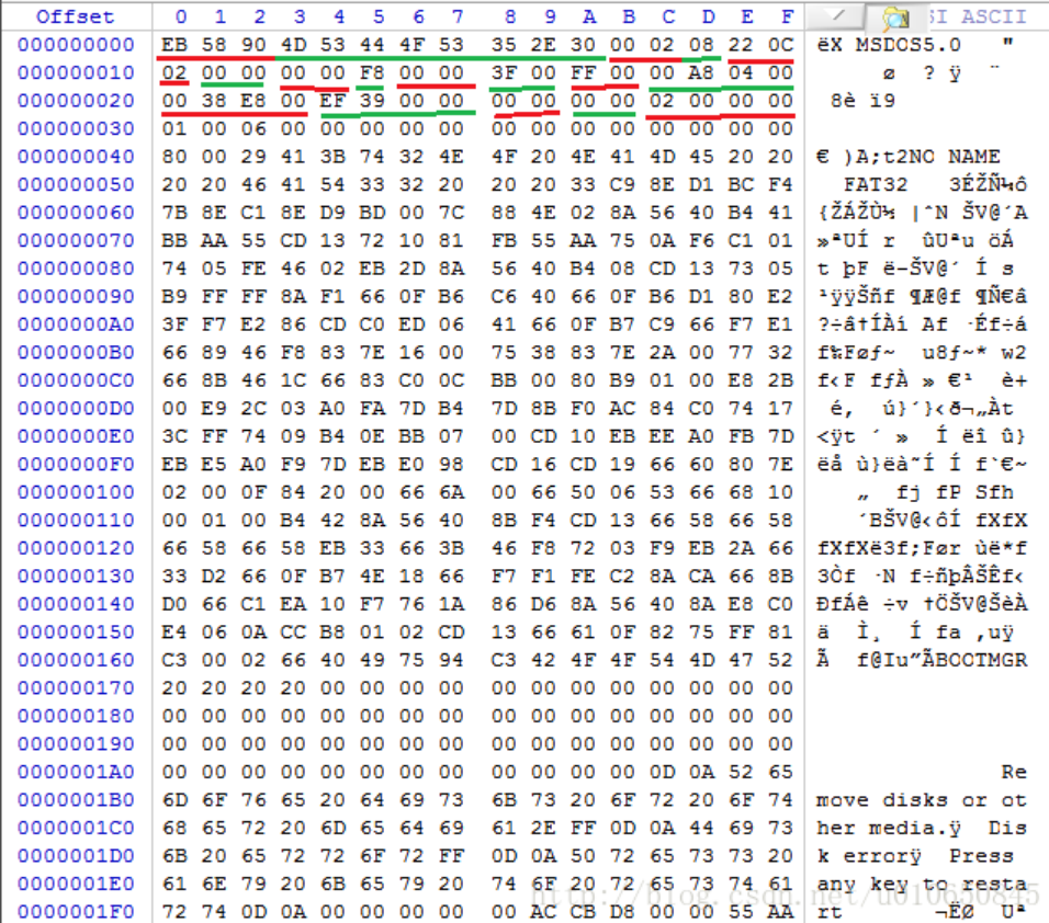 - 0x20~0x23:4字节,文件系统总扇区数,0x00E83800=15218688