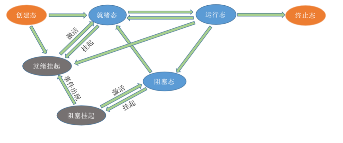 - 挂起态→就绪态、阻塞挂起→阻塞态