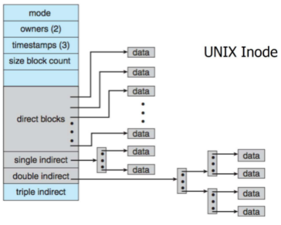 给每个文件赋予一个i-node(index-node)的数据结构,其中列出了文件属性和文件块的磁盘地址。