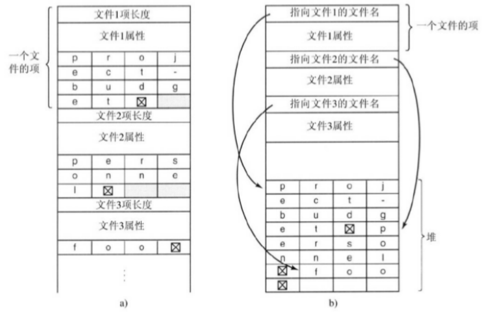 - 长文件名(b)方法,文件项存放指向文件名的指针,文件名存储在堆中,文件名不需要再从字的边界开始,堆中不会有空隙,但是需要有好多指针。