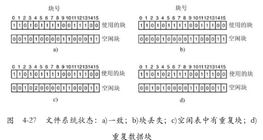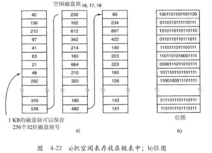 - 位图:n个块的磁盘需要n位的位图,空闲块用1表示,反之用0表示。