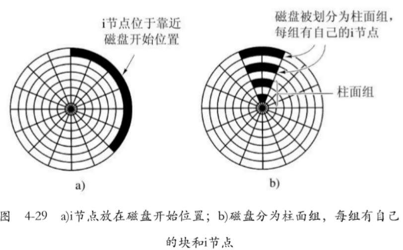 - 把磁盘分为柱面组,每个组有自己的块和i-node(这样快)
