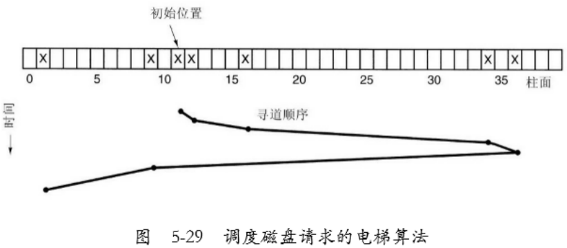 当一个请求处理完成后,磁盘or电梯 驱动检查位,如果是UP,就移到下一个更高的未完成的请求。如果更高位置没有未完成请求,方向位取反,变为DOWN,同时存在一个地位置请求,就移向该位置。