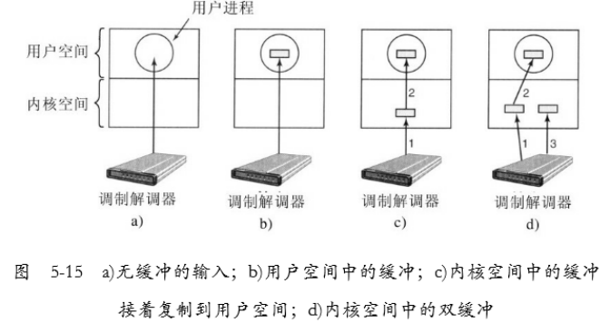 - 用户缓冲:放入缓冲区直到字符填满。(如果缓冲区被分页调出内存,就把缓冲区锁定在内存中,可能会下降系统性能)