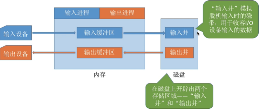 - 输出井:模拟脱机输出时候的磁带,收容用户进程输出的数据